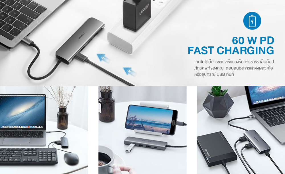 - ช่องเสียบ USB 3.0 Hub 3 ช่องเสียบ, PD Charge USB-C 60w 1 ช่องเสียบ