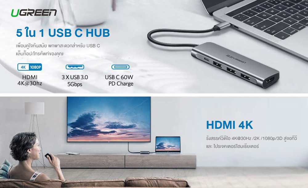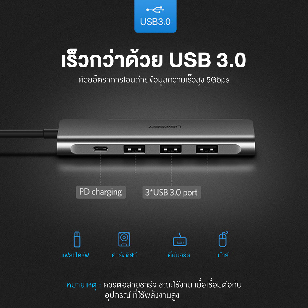 UGREEN รุ่น 50209 ตัวแปลง USB-C / ThunderBolt3 มัลติพอร์ต 5 ใน 1 เป็น HDMI รองรับ 4K @30Hz, USB 3.0 Hub 3 ช่องเสียบ, USB-C 60w 1 ช่องสียบ ช่วยให้คุณสามารถเชื่อมต่อคอมพิวเตอร์, โน๊ตบุ๊ค, เข้ากับโปรเจคเตอร์, จอคอม, ทีวีและจอแสดงผลได้ด้วยพอร์ต HDMI สำหรับแสดงผลภาพจอขนาดใหญ่ สนับสนุนความละเอียด HDMI สูงถึง 4K @30Hz วัสดุ Aluminum Alloy แข็งแรงทนทาน รับประกันคุณภาพโดย Gadget Villa (ประเทศไทย)