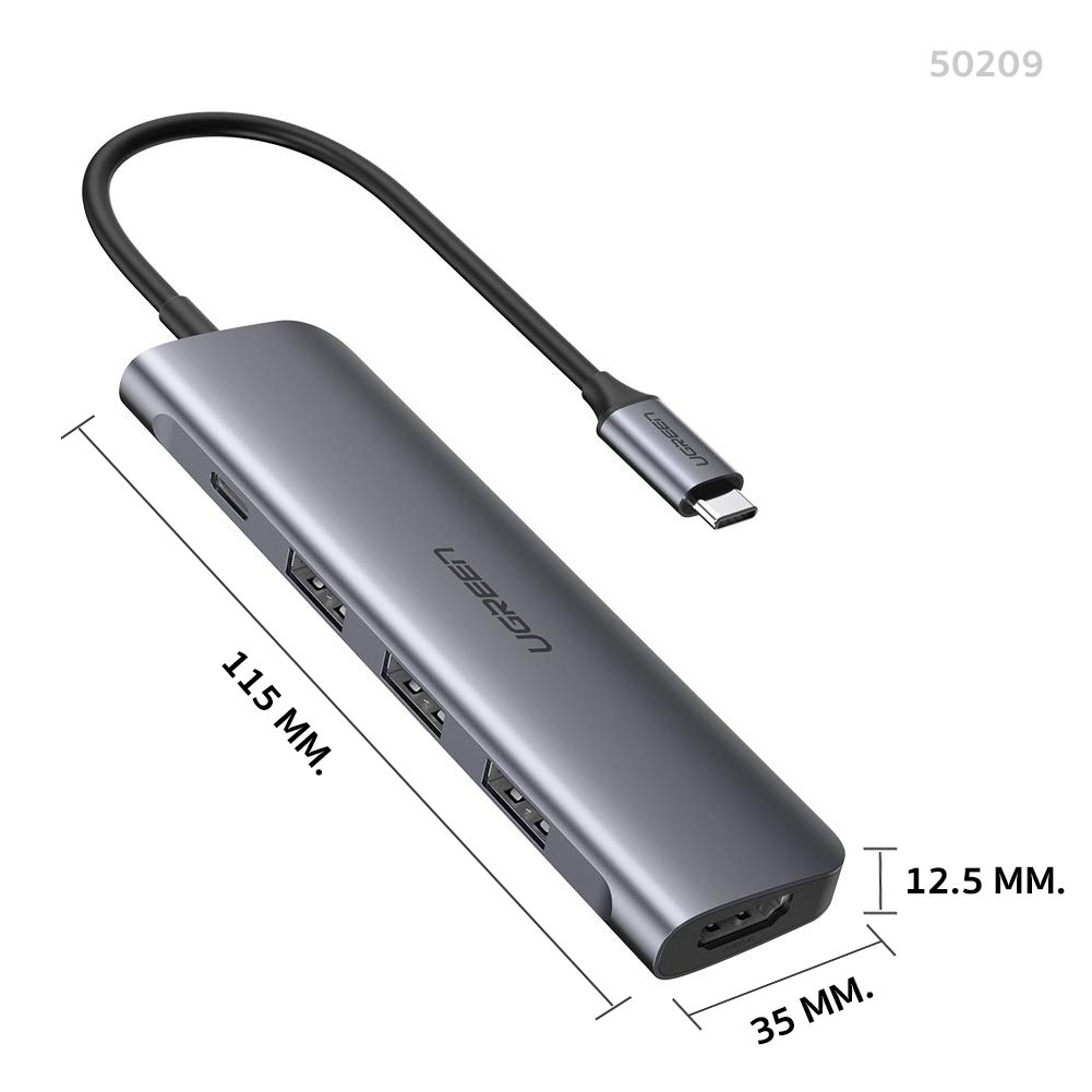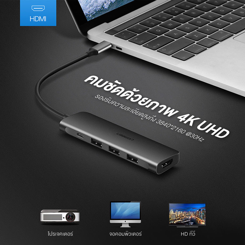 UGREEN รุ่น 50209  ตัวแปลง USB-C / ThunderBolt3 มัลติพอร์ต 5 ใน 1 เป็น HDMI รองรับ 4K @30Hz, USB 3.0 Hub 3 ช่องเสียบ, PD Charge USB-C 60w 1 ช่องสียบ ช่วยให้คุณสามารถเชื่อมต่อคอมพิวเตอร์, โน๊ตบุ๊ค, Apple, เข้ากับโปรเจคเตอร์, จอคอม, ทีวีและจอแสดงผลได้ด้วยพอร์ต HDMI สำหรับแสดงผลภาพจอขนาดใหญ่ สนับสนุนความละเอียด  HDMI  สูงถึง 4K @30Hz วัสดุ Aluminum alloy แข็งแรงทนทาน รับประกันคุณภาพโดย Gadget Villa (ประเทศไทย)